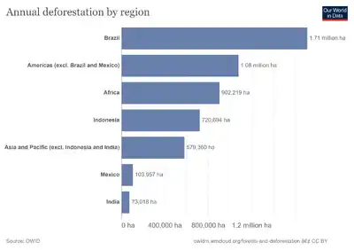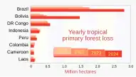 Brazil once had the highest deforestation rate in the world,[1] and recent data still shows high rates of deforestation.[2][3] Between 2001 and 2023, Brazil lost 68.9 Mha of tree cover (13% of its total tree cover lost since 2000),[4] and in 2022, Brazilian forest loss accounted for 43% of global deforestation.[5] In 2005, Brazil still had the largest area of forest removed annually.[1] Since 1970, over 700,000 square kilometres (270,000 sq mi) of the Amazon rainforest have been destroyed. In 2001, the Amazon was approximately 5,400,000 square kilometres (2,100,000 sq mi), which is only 87% of the Amazon's original size.[6] According to official data, about 729,000 km² have already been deforested in the Amazon biome, which corresponds to 17% of the total. 300,000 km² have been deforested in the last 20 years.[7]
