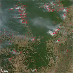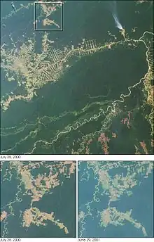 ![]() A NASA satellite observation of deforestation near Rio Branco in Brazil, July 2000 | |