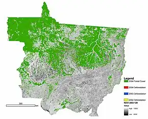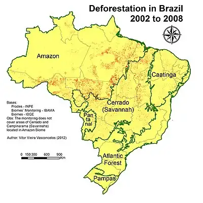 - ↑ "VASCONCELOS, Vitor Vieira. Map of Deforestation in Brazil for each Biome: 2002 to 2008. Ministério Público de Minas Gerais. Coordenadoria Geral de Promotorias por Bacias Hidrográficas. 2012". Retrieved 15 April 2018.
