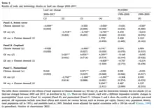 The pressure on deforestation in the Amazon has affected the trade and agricultural productivity in Brazil. One of the leading countries in the demand for agricultural products has been China. The interest from China comes from Brazil's port investments and land infrastructure, which will ensure a fast and efficient transport network for China. This increased demand from China involves a two-step process, using remote-sensing data. The first step of the process comes from international trade flow data, which is used to compute the differential growth in Chinese demand for each product (excluding Brazil). The second step takes the Chinese-product-specific demand growth to municipalities in Brazil based on their production composition in 1995.[104] The data used was sourced from MapBiomas in Brazil, which classifies the land use based on 30-meter LANDSAT images.[105] The exposure to trade with China mitigated the deforestation impacts from new soy technology. In table 2 column 4 in the image to the right, there is a change in the coefficients associated with Chinese demand. Regions that were heavily impacted by both trade and technology shocks saw less deforestation and slower cropland expansion compared to areas that were only influenced by genetically engineered (GE) soy. This suggests that the deforestation effects of GE soy are mitigated in areas with greater exposure to technological advancements and increased demand from China.[106]