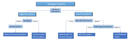 - ↑ 1.0 1.1 1.2 1.3 1.4 1.5 1.6 Tang, C; Zafar Gondal, A; Damian, M (January 2020). "Delayed Puberty". StatPearls. PMID 31335042.
