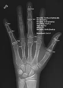 Since bone maturation is a good indicator of overall physical maturation, an x-ray of the left hand and wrist to assess bone age usually reveals whether the child has reached a stage of physical maturation at which puberty should be occurring.[3][7] X-ray displaying a bone age <11 years in girls or <13 years in boys (despite a higher chronological age) is most often consistent with constitutional delay of puberty.[7][40] An MRI of the brain should be considered if neurological symptoms are present in addition to delayed puberty, two findings suspicious for pituitary or hypothalamic tumors.[3][10] An MRI can also confirm the diagnosis of Kallmann syndrome due to the absence or abnormal development of the olfactory tract.[10] However in the absence of clear neurological symptoms, an MRI may not be the most cost-effective option.[10] A pelvic ultrasound can detect anatomical abnormalities including undescended testes and müllerian agenesis.[3][39]