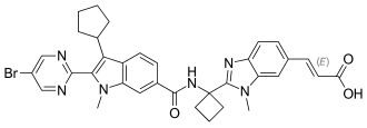 Deleobuvir (formerly BI 207127) was an experimental drug for the treatment of hepatitis C. It was being developed by Boehringer Ingelheim. It is a non-nucleoside hepatitis C virus NS5B polymerase inhibitor. Deleobuvir was tested in combination regimens with pegylated interferon and ribavirin, and in interferon-free regimens with other direct-acting antiviral agents including faldaprevir.