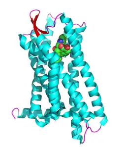 The δ-opioid receptor, also known as delta opioid receptor or simply delta receptor, abbreviated DOR or DOP, is an inhibitory 7-transmembrane G-protein coupled receptor coupled to the G protein Gi/G0 and has enkephalins as its endogenous ligands.[5] The regions of the brain where the δ-opioid receptor is largely expressed vary from species model to species model. In humans, the δ-opioid receptor is most heavily expressed in the basal ganglia and neocortical regions of the brain.[6]