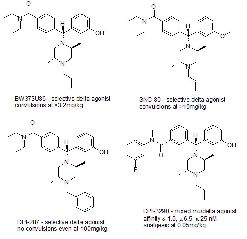 - ↑ Jutkiewicz EM, Baladi MG, Folk JE, Rice KC, Woods JH (June 2006). "The convulsive and electroencephalographic changes produced by nonpeptidic delta-opioid agonists in rats: comparison with pentylenetetrazol". The Journal of Pharmacology and Experimental Therapeutics. 317 (3): 1337–1348. doi:10.1124/jpet.105.095810. PMID 16537798. S2CID 21838231.