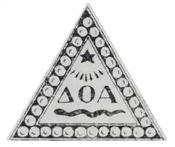 Delta Omicron Alpha's badge was a black enameled triangle, edged with jewels.[2][1] It was decorated with gold Greek letters ΔΟΑ in the center.[2][1] A gold star was above the letters, with a gold serpent below the letters.[1][2]