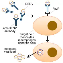 It is not entirely clear why secondary infection with a different strain of dengue virus places people at risk of dengue hemorrhagic fever and dengue shock syndrome. The most widely accepted hypothesis is that of antibody-dependent enhancement (ADE). The exact mechanism behind ADE is unclear. It may be caused by poor binding of non-neutralizing antibodies and delivery into the wrong compartment of white blood cells that have ingested the virus for destruction.[32][35] There is a suspicion that ADE is not the only mechanism underlying severe dengue-related complications,[20][33] and various lines of research have implied a role for T cells and soluble factors such as cytokines and the complement system.[48]
