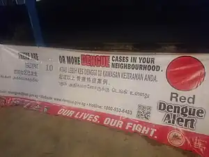 A poster in Tampines, Singapore, notifying people that there are ten or more cases of dengue in the neighbourhood (November 2015).