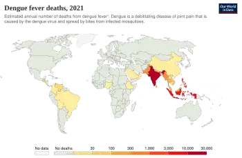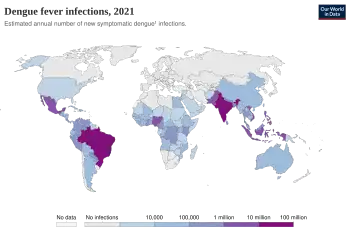 Dengue has become a global problem since the Second World War and is common in more than 120 countries, mainly in Southeast Asia, South Asia and South America.[13][14][15] About 100 to 400 million people are infected a year and approximately 40,000 die.[5][6] In 2019 a significant increase in the number of cases was seen.[16] The earliest descriptions of an outbreak date from 1779.[15] Its viral cause and spread were understood by the early 20th century.[17] Apart from eliminating the mosquitos, work is ongoing for medication targeted directly at the virus.[18] It is classified as a neglected tropical disease.[19]