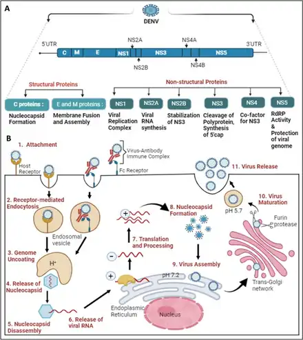 32. 32.00 32.01 32.02 32.03 32.04 32.05 32.06 32.07 32.08 32.09 Rodenhuis-Zybert IA, Wilschut J, Smit JM (August 2010). "Dengue virus life cycle: viral and host factors modulating infectivity" (PDF). Cellular and Molecular Life Sciences. 67 (16): 2773–86. doi:10.1007/s00018-010-0357-z. PMID 20372965. S2CID 4232236. Archived (PDF) from the original on 9 October 2022. Retrieved 2 August 2020.
