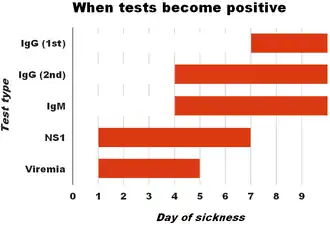 These laboratory tests are only of diagnostic value during the acute phase of the illness with the exception of serology. Tests for dengue virus-specific antibodies, types IgG and IgM, can be useful in confirming a diagnosis in the later stages of the infection. Both IgG and IgM are produced after 5–7 days. The highest levels (titres) of IgM are detected following a primary infection, but IgM is also produced in reinfection. IgM becomes undetectable 30–90 days after a primary infection, but earlier following re-infections. IgG, by contrast, remains detectable for over 60 years and, in the absence of symptoms, is a useful indicator of past infection. After a primary infection, IgG reaches peak levels in the blood after 14–21 days. In subsequent re-infections, levels peak earlier and the titres are usually higher. Both IgG and IgM provide protective immunity to the infecting serotype of the virus.[23][27][35] In testing for IgG and IgM antibodies there may be cross-reactivity with other flaviviruses which may result in a false positive after recent infections or vaccinations with yellow fever virus or Japanese encephalitis.[25] The detection of IgG alone is not considered diagnostic unless blood samples are collected 14 days apart and a greater than fourfold increase in levels of specific IgG is detected. In a person with symptoms, the detection of IgM is considered diagnostic.[23]