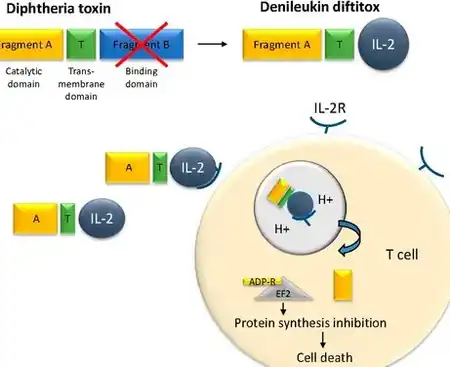 {{cite journal}}: CS1 maint: unflagged free DOI (link) - ↑ Turturro F (January 2007). "Denileukin diftitox: a biotherapeutic paradigm shift in the treatment of lymphoid-derived disorders". Expert Review of Anticancer Therapy. 7 (1): 11–7. doi:10.1586/14737140.7.1.11. PMID 17187516. S2CID 9028829.