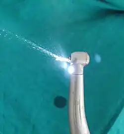 A dental aerosol is an aerosol that is produced from dental instrument, dental handpieces, three-way syringes, and other high-speed instruments. These aerosols may remain suspended in the clinical environment.[1] Dental aerosols can pose risks to the clinician, staff, and other patients. The heavier particles (e.g., >50 μm) contained within the aerosols are likely to remain suspended in the air for relatively short period and settle quickly onto surfaces, however, the lighter particles may remain suspended for longer periods and may travel some distance from the source.[2] These smaller particles are capable of becoming deposited in the lungs when inhaled and provide a route of diseases transmission.[3] Different dental instruments produce varying quantities of aerosol, and therefore are likely to pose differing risks of dispersing microbes from the mouth. Air turbine dental handpieces generally produce more aerosol, with electric micromotor handpieces producing less, although this depends on the configuration of water coolant used by the handpiece.[4][5]
