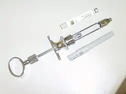A dental syringe is a syringe for the injection of a local anesthetic.[25] It consists of a breech-loading syringe fitted with a sealed cartridge containing an anesthetic solution.