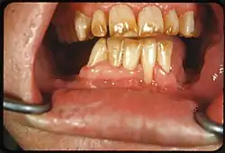 - ↑ Beltrán-Aguilar ED, et al. (August 26, 2005). "Surveillance for Dental Caries, Dental Sealants, Tooth Retention, Edentulism, and Enamel Fluorosis — United States, 1988–1994 and 1999–2002". Morbidity and Mortality Weekly Report. Surveillance Summaries. 54 (3): 1–44. PMID 16121123.