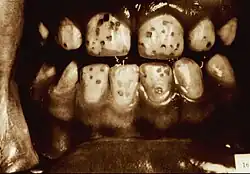In 1901 Eager published the first description of the "mottled enamel" of immigrants from a small village near Naples, Italy.[32] He writes that the condition is called "Denti di Chiaie" (Chiaie teeth), named after Stefano Chiaie, an Italian professor.[32] In the United States of America, a dentist, Frederick McKay, set up practice in Colorado Springs in 1901 and discovered a high proportion of the residents had stained teeth, locally termed the "Colorado brown stain".[11] He took this information to Greene Vardiman Black, a prominent American dentist of the time. After examining specimens of affected enamel, in 1916 Black described the condition as "[a]n endemic imperfection of the enamel of the teeth, heretofore unknown in the literature of dentistry."[11] They made the interesting observation that although the mottled enamel was hypomineralized, and therefore should be more susceptible to decay, this was not the case.[11] Gradually, they became aware of existing and further reports of a similar condition worldwide.[11]