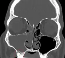 Sinusitis is inflammation of the paranasal air sinuses. Odontogenic sinusitis is that which results of dental disease, most often resulting from prior dentoalveolar procedures, infections of maxillary dentition, or maxillary dental trauma.[6] Infections associated with teeth may be responsible for approximately 20% of cases of maxillary sinusitis.[7] The cause is usually a periapical or periodontal infection of a maxillary posterior tooth, where the inflammatory exudate has eroded through the bone superiorly to drain into the maxillary sinus. Treatment of the underlying dental disease is the first step in the treatment of odontogenic sinusitis, however recent a portion require endoscopic sinus surgery for successful resolution.[6] Once an odontogenic infection involves the maxillary sinus, it is possible that it may then spread to the orbit or to the ethmoid sinus.[7]