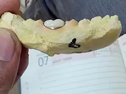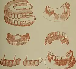 The use of "false teeth" has prevailed throughout the course of history. Archaeological evidence dating back to 1500 B.C. was found in Egypt.[15] The Egyptians would use real teeth threaded with a gold wire to create a false set of teeth. In northern Italy 700 B.C., the Etruscans made dentures out of animal teeth.[16] Hence the world of dental prosthodontics began to take shape. Despite being made of low quality material and having short life spans, dentures were relatively popular.