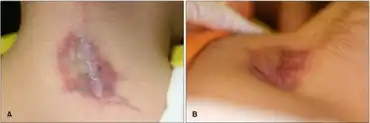 | Medallion-like dermal dendrocyte hamartoma-a,b)solitary, depressed, erythematous to yellowish plaque with fine wrinkles | |