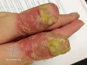 Dermatitis repens, also known as acrodermatitis continua, is an inflammatory skin condition, a type of localized pustular psoriasis that typically presents with sterile pustules beginning at one or more finger tips or toes.[1][2]