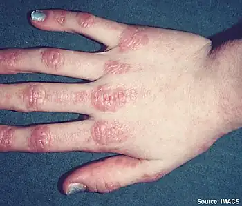 One form the rashes take is called "heliotrope" (a purplish color) or lilac, but may also be red. It can occur around the eyes along with swelling, but also occurs on the upper chest or back what is called the "shawl" (around the neck) or "V-sign" above the breasts and may also occur on the face, upper arms, thighs, or hands.[5] Another form the rash takes is called Gottron's sign which are red or violet, sometimes scaly, slightly raised papules that erupt on any of the finger joints (the metacarpophalangeal joints or the interphalangeal joints).[5][6] Gottron's papules may also be found over other bony prominences including the elbows, knees, or feet. All these rashes are made worse by exposure to sunlight, and are often very itchy, painful, and may bleed.[6]