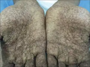 Symptoms include lack of sweat glands, thin hair, brittle nails, mottled skin, and lack of fingerprints.[5] It is also characterized by a widespread, early-onset reticulate hyperpigmentation.[6] Those afflicted may also have adermatoglyphia, abnormal epithelial differentiation, palmoplantar hyperkeratosis of the palms and soles, acral dorsal blistering, as well as hypohidrosis or hyperhidrosis.[6][4]