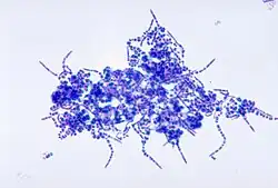 Dermatophilus congolensis is a Gram-positive bacterium and the cause of a disease called dermatophilosis (sometimes called mud fever) in animals and humans, a dermatologic condition that manifests as the formation of crusty scabs containing the microorganism. It has been erroneously called mycotic dermatitis.[1] Rainscald is another condition often seen in animals, which is also caused by D. congolensis.