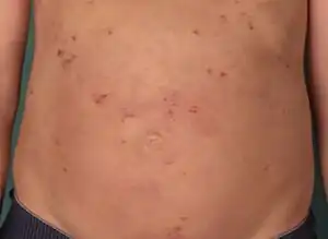 Itchy reddish to brownish bumps and patches starting in stretch marks of the abdomen.[6]