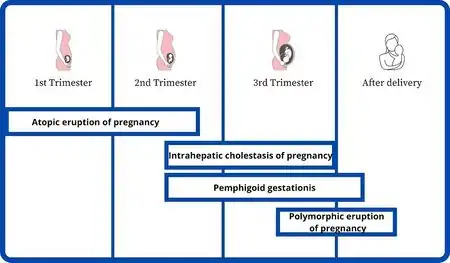 - ↑ 3.0 3.1 3.2 3.3 3.4 Roth, MM (1 February 2011). "Pregnancy dermatoses: diagnosis, management, and controversies". American journal of clinical dermatology. 12 (1): 25–41. doi:10.2165/11532010-000000000-00000. PMID 21110524.