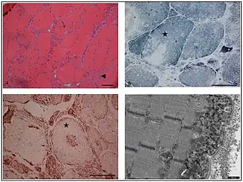 - ↑ 3.0 3.1 3.2 3.3 3.4 3.5 3.6 Goldfarb LG, Vicart P, Goebel HH, Dalakas MC (April 2004). "Desmin myopathy". Brain. 127 (Pt 4): 723–34. doi:10.1093/brain/awh033. PMID 14724127.