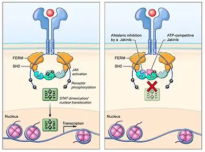- ↑ Alexander, Madison; Luo, Yiming; Raimondi, Giorgio; O'Shea, John J.; Gadina, Massimo (30 December 2021). "Jakinibs of All Trades: Inhibiting Cytokine Signaling in Immune-Mediated Pathologies". Pharmaceuticals (Basel, Switzerland). 15 (1): 48. doi:10.3390/ph15010048. ISSN 1424-8247.
