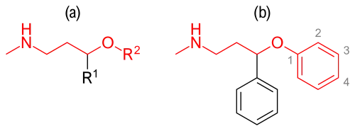 Compounds containing an aryloxypropylamine motif in their structure, demonstrated in figure 3a, are known as monoamine reuptake inhibitors. Drugs containing this privileged structural motif, where R1 and R2 are aryls or heteroaryls, preferable phenyl, possess a selectivity profile for NET and SERT.[40] While compounds containing a substituent in the 2'-position of the aroxyl ring of the structure (figure 3b) exhibits selectivity and high affinity for NET, and are therefore generally SNRIs, compounds having substituent in the 4'-position exhibits selectivity and high affinity for SERT and are therefore generally SSRIs, e.g. fluoxetine and paroxetine.[41]
