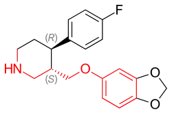 Paroxetine is a constrained structural analogue of fluoxetine where the linear phenylpropylamine group of fluoxetine has been folded into a piperidine ring (figure 5). The compound has the possibility of four stereoisomers because it contains two chiral centers, but one of them, the (3S,4R)-isomer, is marketed as paroxetine. Research has shown that stereochemical factors affect affinity of the molecule for SERT where substitution into the 2-ortho-position of either aromatic rings decreases affinity for rat SERT by as much as 10–100 times, where the greatest loss occurs in the phenoxy ring.[6]