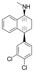 Tametraline, a compound synthesized in 1978 by Pfizer, was shown to be a potent NE and DA re-uptake inhibitor with animal studies.[6] Later on a surprisingly substantial enhancement of blocking activity of 5-HT uptake was achieved by adding chlorine atoms at C-3 and C-4 to the structure of tametraline, resulting in (+)-trans-(1R,4S)-N-methyl-4-phenyl-1-aminotetralin, a potent but nonselective uptake blocker. The (+)-cis-(1S,4S)-isomer, one of four compounds diastereomers, however exhibited significantly more selective and potent 5-HT uptake inhibiting activity compared to the other three diastereomers, where the 4-phenyl ring favours attachments at 5-HT uptake sites. The compound was named sertraline (figure 8).[6][45] Although sertraline appears to differ structurally from the other SSRIs, it has a phenylaminotetralin in its structure, in which the diphenylpropylamine nucleus has been forced into a stiff bicyclic ring system.[6]