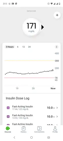 In 2018, the FDA approved the Dexcom G6 for use as a stand-alone CGM, and for integration with compatible insulin pumps, making it the first continuous glucose monitor capable of direct integration with insulin pumps.[19][A] The G6 was also the first CGM to operate without the need for calibrations, removing the requirement for routine fingerstick blood tests.[21][22] However, actual blood glucose levels can differ from the levels reported by the CGM.[23] The device retained compatibility with Dexcom's existing mobile applications, including Dexcom Share, which allows users to share glucose data with others, and Dexcom Clarity, which provides long-term trend analysis and reports.[24] As of 2025, the Dexcom G6 remains available.[5]