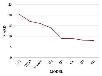 The accuracy of Dexcom CGM systems has steadily improved over time, as reflected in declining MARD values across successive generations. The original Dexcom STS, released in 2006, had a MARD of approximately 20.3%,[54] while the Dexcom Seven, introduced in 2007, reduced this to around 17%. The Seven Plus had a slightly lower MARD of 16%.[55] The G4 Platinum, launched in 2012, further improved accuracy with a MARD of 13.9%,[56] followed by the G5 Mobile in 2015, which achieved 9%—the first Dexcom system to reach single-digit accuracy.[57] in some users, however it also was found to be as high as 15%.[58] The Dexcom G6, released in 2018, was similarly marketed with a MARD of 9%,[59] although some studies found values exceeding 12% in certain individuals.[60] The most recent model, the Dexcom G7, features a redesigned sensor and updated algorithm, yielding a MARD of 8.2% in adults and 8.1% in children.[61] The newest iteration of the Dexcom CGM, the Dexcom G7 15-Day CGM, has an even lower MARD of 8% in adult users.[34]