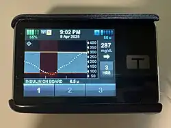 The Tandem t:slim X2 insulin pump, made by Tandem Diabetes,[68] can be integrated with the Dexcom G6 or Dexcom G7 Continuous Glucose Monitoring Systems to automate glucose regulation.[66] Using real-time glucose data from the CGM, the t:slim X2 uses an algorithm to adjust insulin delivery based on these readings, helping to prevent glucose highs and lows. This integration enables more flexible management of blood sugar levels throughout the day.[69]
