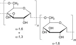 The polymer main chain consists of α-1,6 glycosidic linkages between glucose monomers, with branches from α-1,3 linkages. This characteristic branching distinguishes a dextran from a dextrin, which is a straight chain glucose polymer tethered by α-1,4 or α-1,6 linkages.[2]