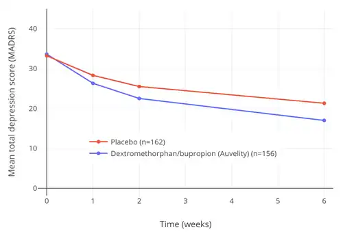 In Study 1 (GEMINI), a six-week randomized controlled trial of dextromethorphan/bupropion versus placebo in people with major depressive disorder, scores on the Montgomery–Åsberg Depression Rating Scale (MADRS)—a scale with a range of 0 to 60 points—decreased with dextromethorphan/bupropion by 15.9 points from a baseline score of 33.6 points (an approximate 47% reduction) and decreased with placebo by 12.1 points from a baseline score of 33.2 points (an approximate 36% reduction).[1][3] This resulted in a least-squares mean difference in reduction of depression scores between dextromethorphan/bupropion and placebo of 3.9 points, with the placebo group showing approximately 76% of the improvement in depression scores as the dextromethorphan/bupropion group and with depression scores at baseline improving overall about 11% more with the medication than with placebo.[1][3] In antidepressant trials of six to eight weeks duration recorded in the Food and Drug Administration (FDA) database, the average difference from placebo with other antidepressants was 2.5 points.[3] The mean improvement in scores with dextromethorphan/bupropion was statistically significant but not clinically significant[9] relative to placebo at all assessed timepoints including at the end of week 1, although at the end of the study some patients did have clinically significant improvement.[1][3]
