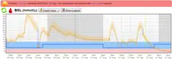 The Standard day data plots, see example 2, shows that trends are easy to see. The blood glucose readings are plotted at their level versus the time of day. Multiple days are plotted on top of each other, creating a scatter of points. In the example shown, it is easy to see the glycemic excursions to high blood sugars following breakfast and lunch. Once identified, this can be improved by using a faster acting insulin, or injecting insulin 20 minutes before eating, or by selecting carbohydrates to eat that are slower to peak in the bloodstream.