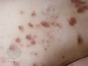 Diabetic dermopathy is a type of skin lesion usually seen in people with diabetes mellitus. It is characterized by dull-red papules that progress to well-circumscribed, small, round, atrophic hyperpigmented skin lesions usually on the shins. It is the most common[1]: 540 [2]: 681 of several diabetic skin conditions, being found in up to 30% of diabetics. Similar lesions can occasionally be found in non-diabetics usually following trauma or injury to the area; however, more than 4 lesions strongly suggests diabetes.