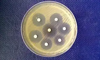 Antibiotic disks are used to test the ability for an antibiotic to inhibit growth of a microorganism. This method, which is commonly used with Mueller–Hinton agar, is used by evenly seeding bacteria over a petri dish and applying an antibiotic treated disk to the top of the agar. By observing the ring formed around the disk formed due to the lack of bacterial growth, the zone of inhibition can be found, which is used to find the susceptibility of an organism to an antibiotic.[26]