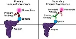 Immunofluorescence is performed by the production of anti-antibodies with a fluorescent molecule attached, making it a chemiluminescent molecule, which provides a glow when subject to ultraviolet light.[14] Antibodies are added to a bacterial solution, providing an antigen for the binding of fluorescent anti-antibody adherence.