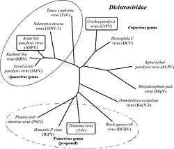 Dicistroviridae is a family of viruses in the order Picornavirales. Invertebrates, including aphids, leafhoppers, flies, bees, ants, and silkworms, serve as natural hosts. There are 16 species in this family, assigned to three genera.[1][2] Diseases associated with this family include: DCV: increased reproductive potential. extremely pathogenic when injected with high associated mortality. CrPV: paralysis and death.[2][3]