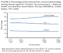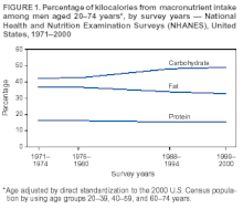 - ↑ 6.0 6.1 6.2 6.3 Centers for Disease Control Prevention (CDC) (February 2004). "Trends in intake of energy and macronutrients—United States, 1971–2000". MMWR. Morbidity and Mortality Weekly Report. 53 (4): 80–2. PMID 14762332. Archived from the original on 2019-06-20. Retrieved 2022-09-13.