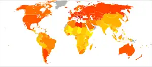 The dietary energy supply is the food available for human consumption, usually expressed in kilocalories per person per day. It gives an overestimate of the total amount of food consumed as it reflects both food consumed and food wasted. The per capita dietary energy supply varies markedly between different regions and countries. It has also changed significantly over time.[1] From the early 1970s to the late 1990s, the average calories available per person per day (the amount of food bought) has increased in all part of the world except Eastern Europe and parts of Africa. The United States had the highest availability with 3654 kilo calories per person in 1996.[2] This increased further in 2002 to 3770.[3] During the late 1990s, Europeans had 3394 kilo calories per person, in the developing areas of Asia there were 2648 kilo calories per person, and in sub-Sahara Africa people had 2176 kilo calories per person.[2][4]