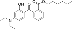 Diethylamino hydroxybenzoyl hexyl benzoate (INCI) is an organic compound used in sunscreens to absorb UVA radiation. It is marketed as Parsol DHHB by DSM and as Uvinul A Plus by BASF. DHHB has an absorption maximum of 354 nm.[1][2] DHHB has excellent photostability and compatibility with other UV absorbers and other cosmetic ingredients.[3]