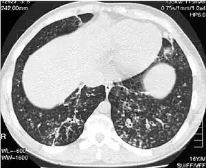 The diagnosis of DPB requires analysis of the lungs and bronchiolar tissues, which can require a lung biopsy, or the more preferred high resolution computed tomography (HRCT) scan of the lungs.[7] The diagnostic criteria include severe inflammation in all layers of the respiratory bronchioles and lung tissue lesions that appear as nodules within the terminal and respiratory bronchioles in both lungs.[4] The nodules in DPB appear as opaque lumps when viewed on X-rays of the lung, and can cause airway obstruction, which is evaluated by a pulmonary function test, or PFT.[6] Lung X-rays can also reveal dilation of the bronchiolar passages, another sign of DPB. HRCT scans often show blockages of some bronchiolar passages with mucus, which is referred to as the "tree-in-bud" pattern.[7] Hypoxemia, another sign of breathing difficulty, is revealed by measuring the oxygen and carbon dioxide content of the blood, using a blood test called arterial blood gas. Other findings observed with DPB include the proliferation of lymphocytes (white blood cells that fight infection), neutrophils, and foamy histiocytes (tissue macrophages) in the lung lining. Bacteria such as H. influenzae and P. aeruginosa are also detectable, with the latter becoming more prominent as the disease progresses.[4][5] The white blood, bacterial and other cellular content of the blood can be measured by taking a complete blood count (CBC). Elevated levels of IgG and IgA (classes of immunoglobulins) may be seen, as well as the presence of rheumatoid factor (an indicator of autoimmunity). Hemagglutination, a clumping of red blood cells in response to the presence of antibodies in the blood, may also occur. Neutrophils, beta-defensins, leukotrienes, and chemokines can also be detected in bronchoalveolar lavage fluid injected then removed from the bronchiolar airways of individuals with DPB, for evaluation.[4][9]