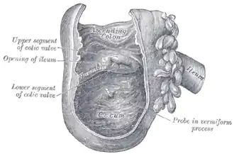 The cecum is a pouch marking the division between the small intestine and the large intestine. It lies below the ileocecal valve in the lower right quadrant of the abdomen.[38] The cecum receives chyme from the last part of the small intestine, the ileum, and connects to the ascending colon of the large intestine. At this junction there is a sphincter or valve, the ileocecal valve which slows the passage of chyme from the ileum, allowing further digestion. It is also the site of the appendix attachment.[38]
