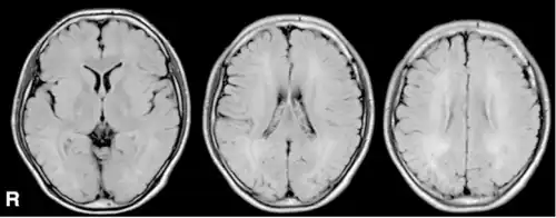 | MRI, FLAIR -diffuse signal increase of deep white matter. | |